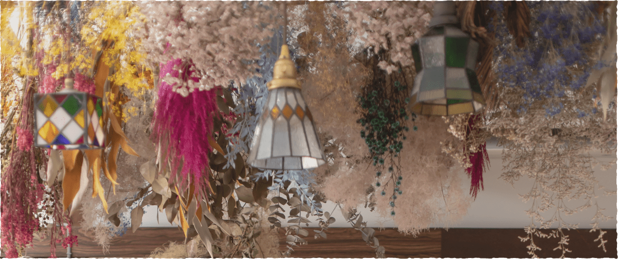 天井にドライフラワーの装飾があり、アンティーク調のソファーが設置してあります。